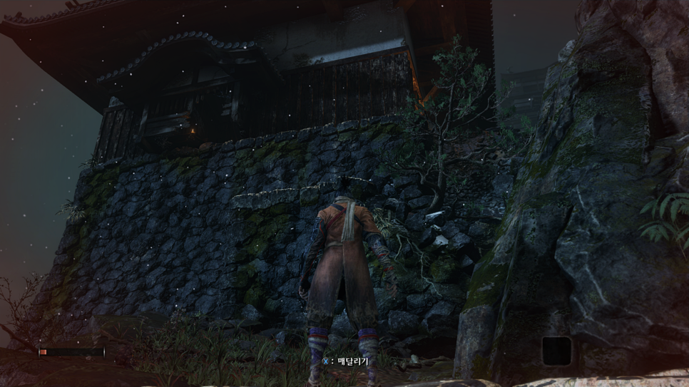 길을따라 우물을 나와주시고 풀숲이 나오면 거기 앉아서 조심히 잠입상태로 진행해주시면 됩니다. 계속 앞으로 가다보면 건물 밑에 뚫린 구멍이 있으니 거기로 들어가주세요. 그리고 계속 길 따라서 진행하다가 왼쪽 벽에 매달릴 수 있는 장소가 있습니다. 거기 매달린 뒤 앞으로 나아가주세요.
